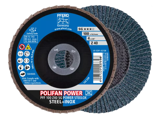 Hill Inventory: 0Pferd 62220. 4-1/2" x 7/8" A.H. POLIFAN Flap Disc - Z SG POWER STEELOX, Zirconia, 80 Grit, Conical. Comes 10 to a Pack, Please Order in Quantitites of 10