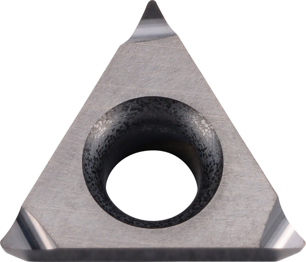 Triangle Insert 7DEG Positive Clearance Angle Chipbreaker & ISO Countersink one side, with hole .156" Inscribe Circle Size 5/64" Thickness .008" Corner Radius UD51 Grade. Factory Stock (MI)