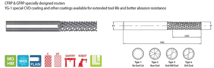 URT5A1AK0250 1/4 x 1/4 x 1 x 3 FIBERGLASS ROUTER MULTI FLUTES BURR END