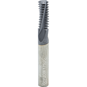 Hill Inventory: 0IN-SHANK W-OUT COOL FOR ISO (METRIC) INT-RH&LH THREAD, PITCH: 01.75mm, SHANK D: 0.312", CUT L: ~0.8" (~20.3mm), FLUTES: 3, GRADE: MT7,